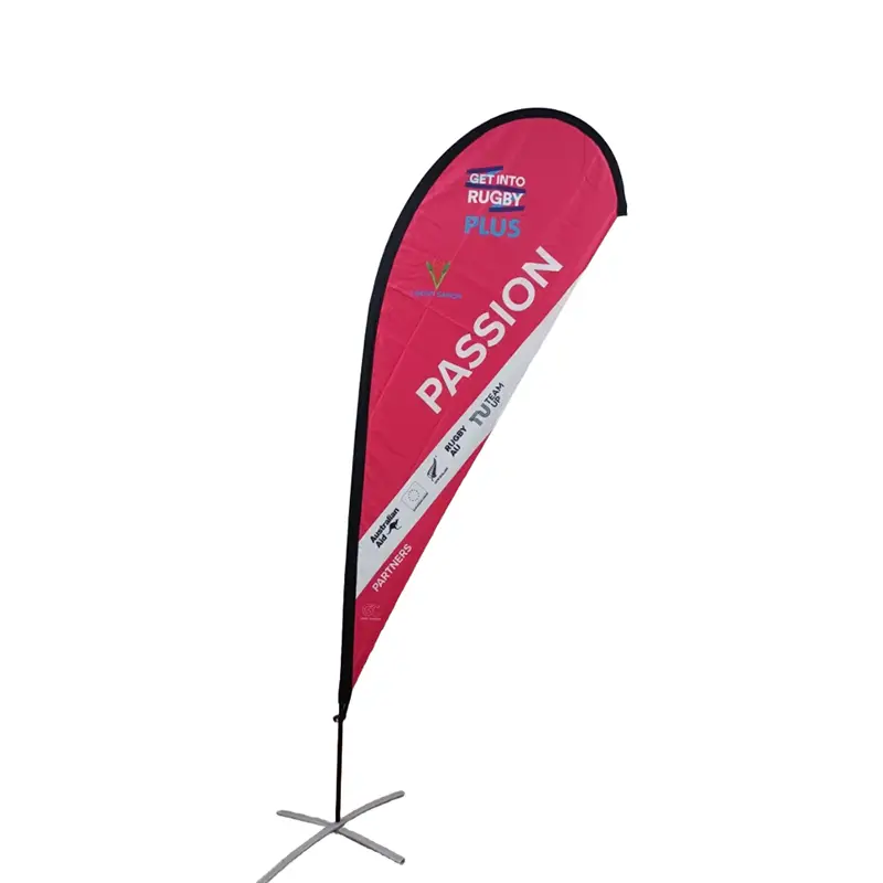 Pangunahing ginagamit ang mga teardrop beach flag sa mga panlabas na kaganapang pang-promosyon at ilang publicity site, tulad ng mga pagpapakita ng produkto sa mga shopping mall, mga promotional setup sa mga supermarket, mga publicity sign para sa mga hotel at gusali ng opisina, pagpapakita ng ilang aktibidad sa paaralan, pagkilala sa mga kalahok sa mga sports event at mga karatula sa advertising para sa mga sponsor.